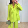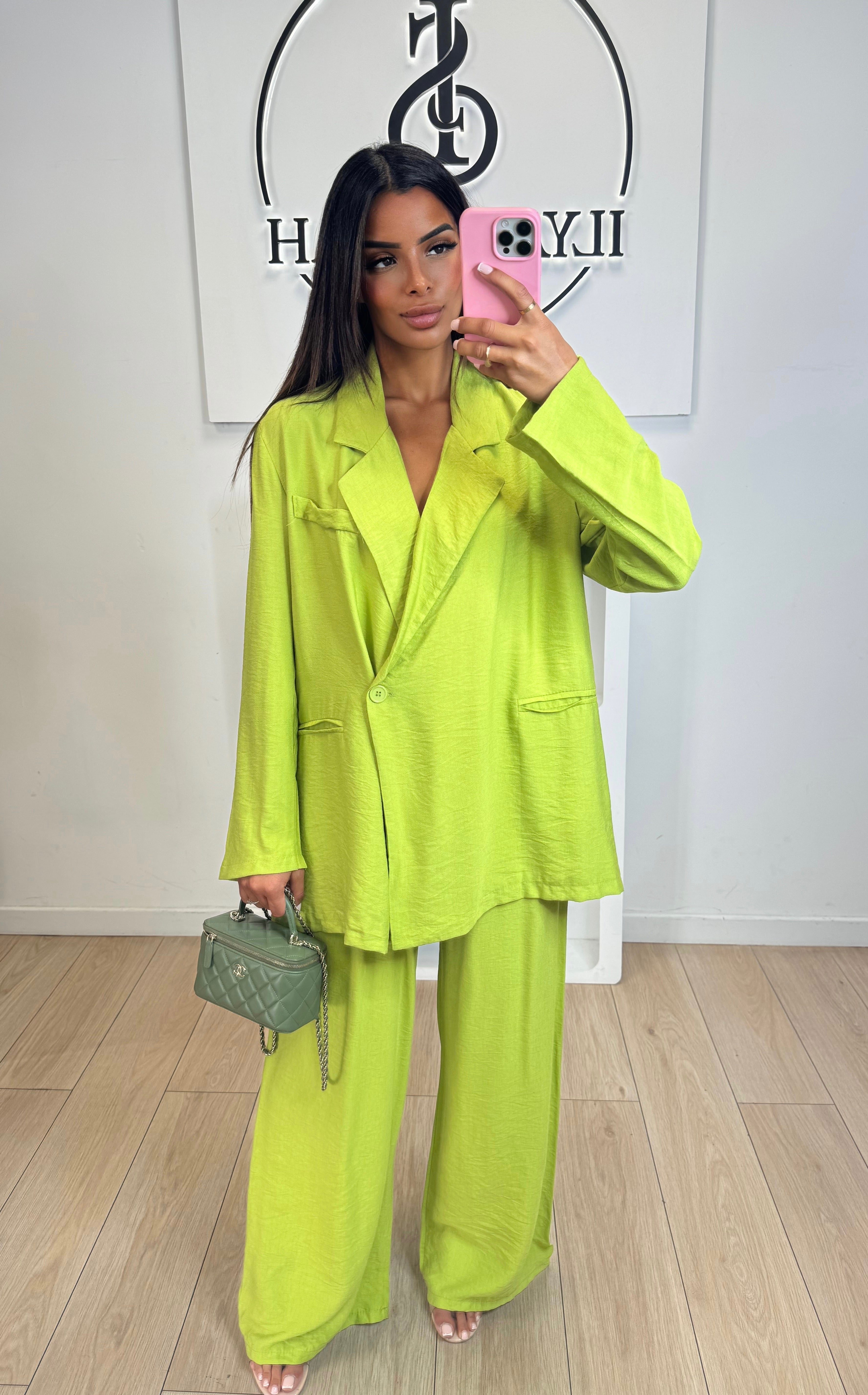 Cet ensemble effet lin comprend un pantalon et une chemise vert, fabriqués en 85% viscose et 15% nylon, pour une coupe fluide et un confort optimal. Avec une taille unique, ce modèle s'adapte à toutes les morphologies. Idéal pour un look tendance et décontracté.